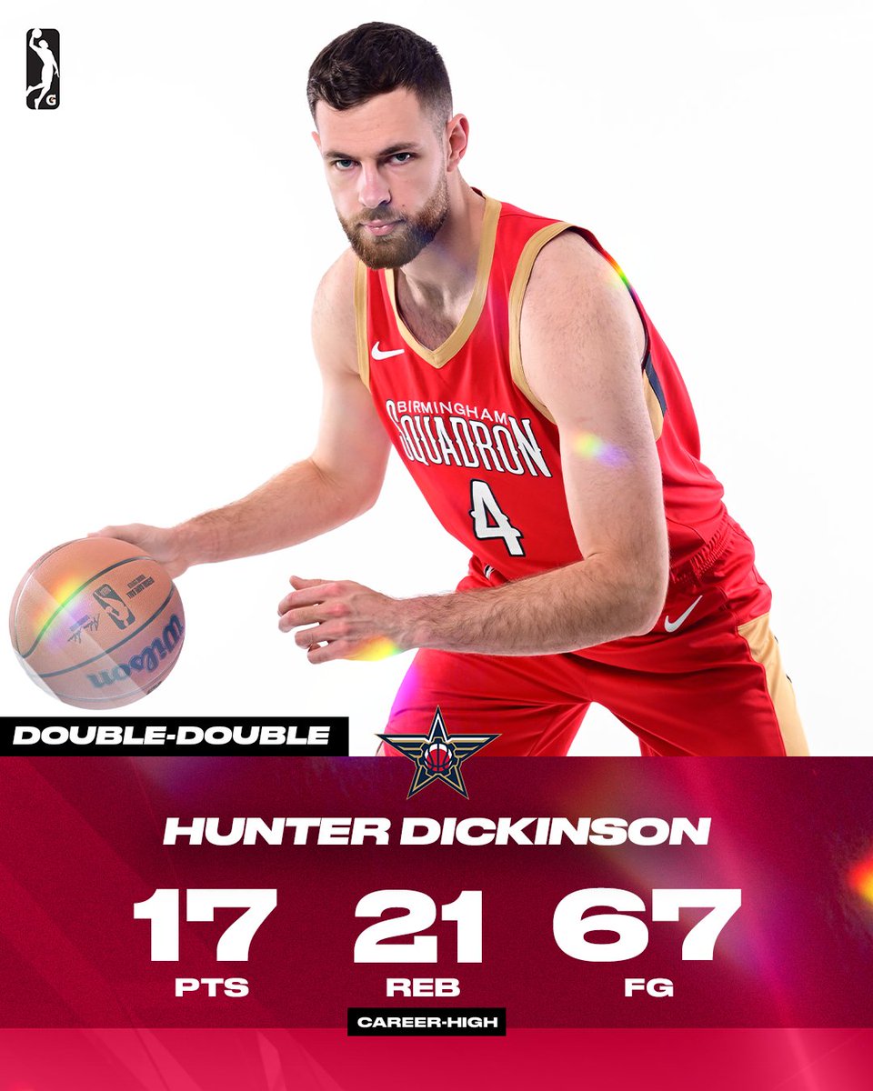 @PelicansNBA two-way Hunter Dickinson was on a rebound ROLL tonight for the @GleagueSquadron with a double-double 17 PTS and a career-high 21 REB!