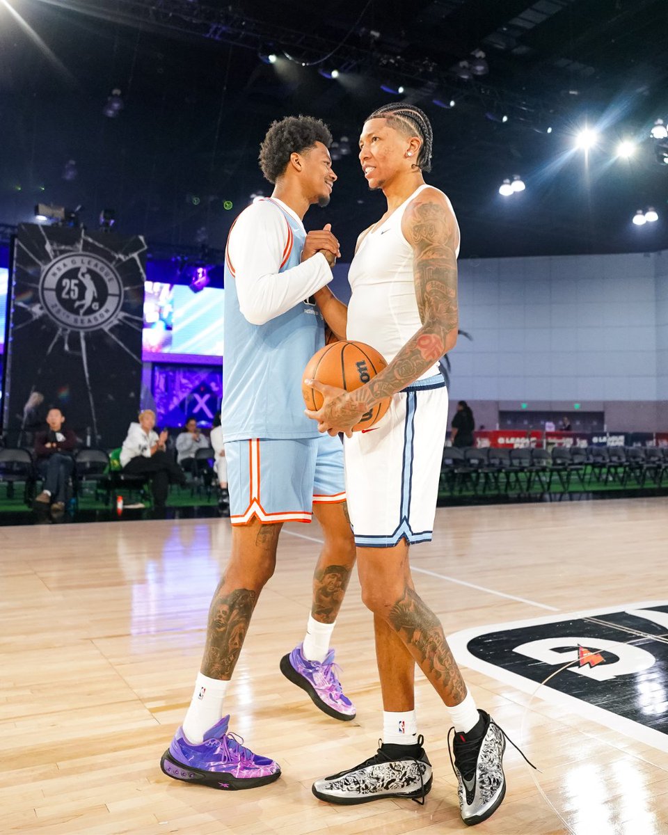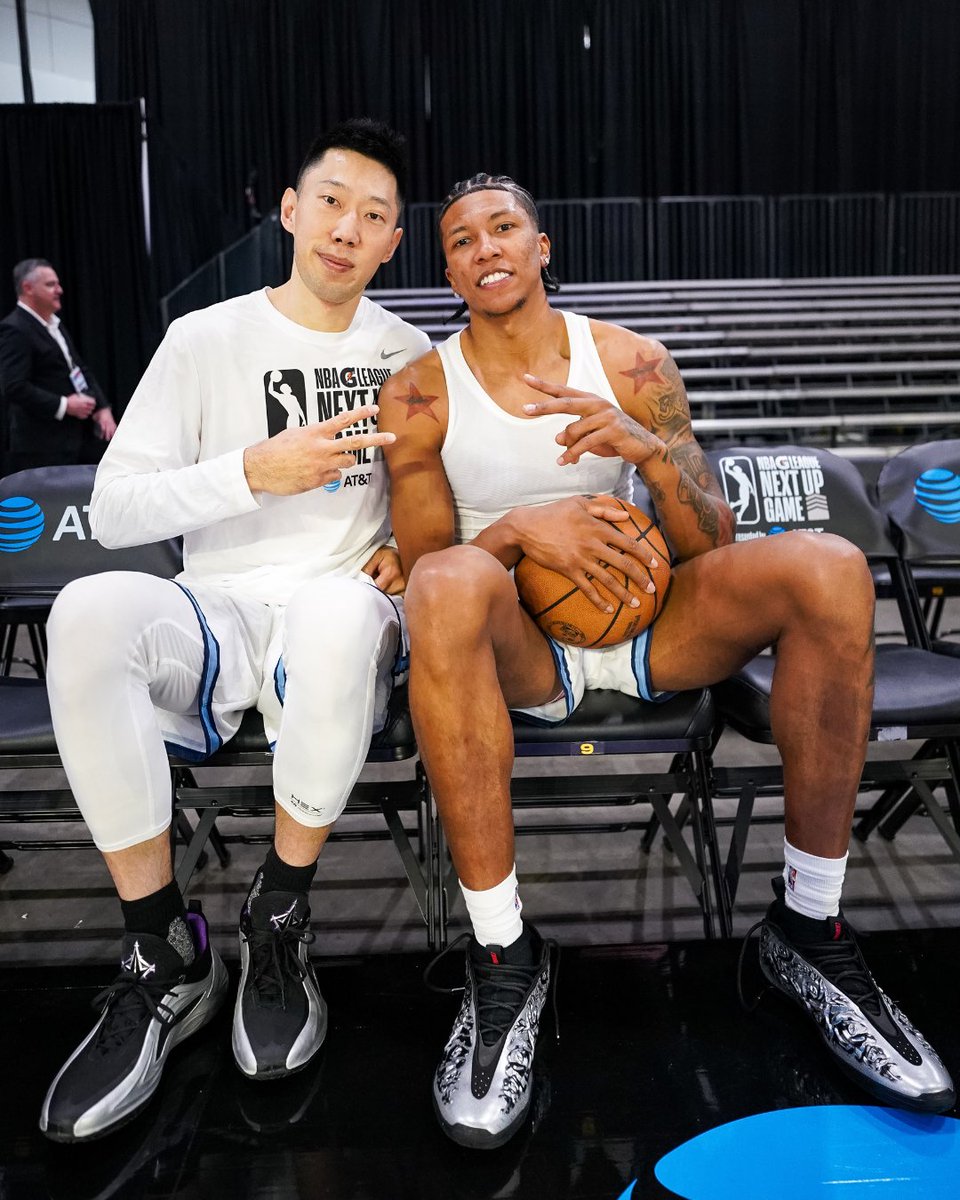Awesome moment from @castrolusa Rising Stars when Tracy McGrady and Carmelo Anthony showed love to Ron Harper Jr. and Yang Hansen! ⭐️ #NBAAllStar