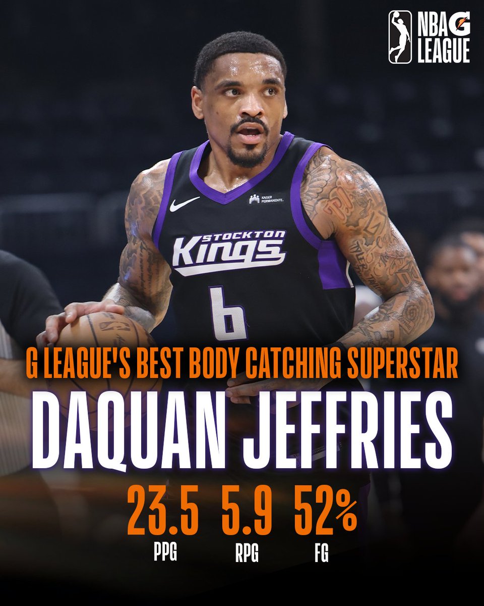 DaQuan Jeffries was catchin' bodies all season! The G League veteran averaged 23.5 PPG on 52% FG and 44% 3PT. He earned an NBA call-up to Sacramento, was named to the All-G League First Team, and led the @stocktonkings to the Finals. π